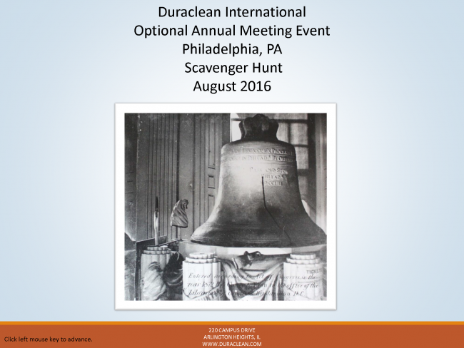 Duraclean’s 86th Anniversary Annual Meeting was held in Philadelphia, PA. Duraclean Annual Meetings always have three main objectives: Socialization Education Recognition The Socialization started with customized scavenger hunt for places and objects throughout the historical district. The second day included a personalized sightseeing tour of Philadelphia. This year, the two day education agenda was heavy…